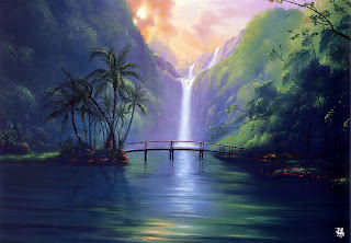 A primeira era um lago muito tranquilo. Este lago era um espelho perfeito onde se refletiam plácidas montanhas que o rodavam. Sobre elas encontrava-se um céu muito azul com tênues nuvens brancas. Todos que olhavam para essa pintura viam refletida uma paz muito grande.